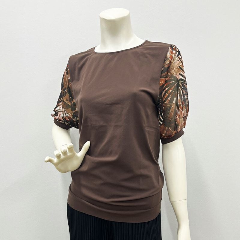 シームレスなのでアウターにも響きにくいし、ボトムスにインにするときにももたつかず、とても便利です。袖のボタニカル柄が夏らしく、速乾性もあるので夏の一枚にぴったりです。ヘビロテまちがいなし!」