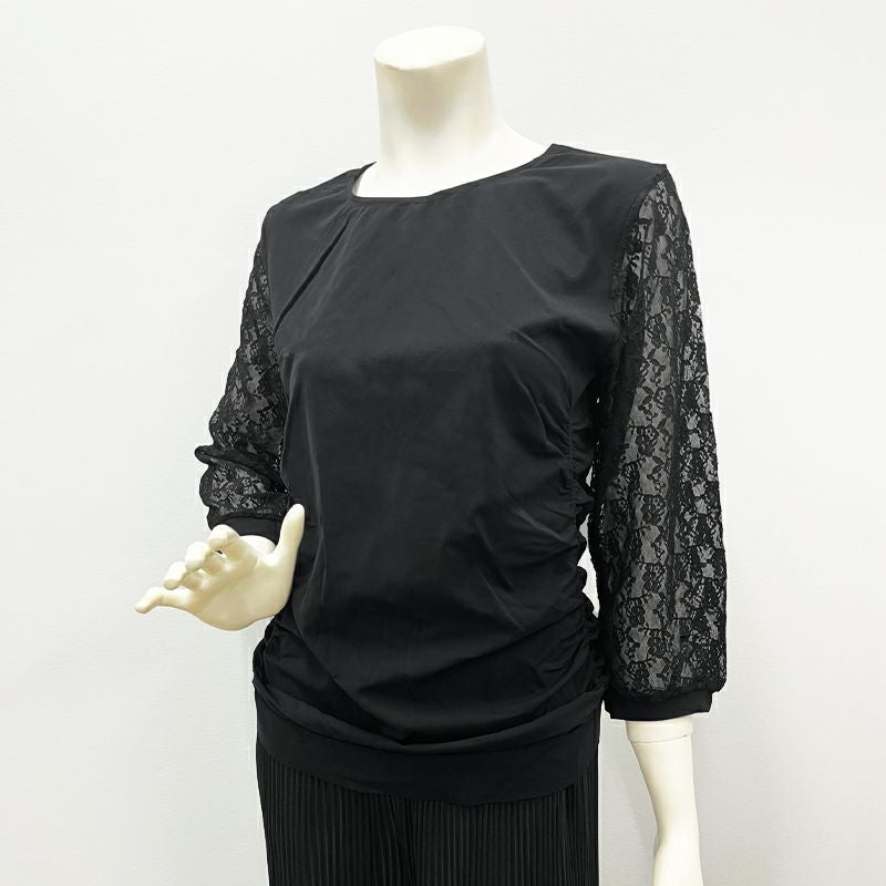 「シックな印象になりがちなブラックのトップスですが、袖のフラワーレースが軽やかな装いに。ブラック&レースの組み合わせが高級感を生み出し、格上げコーデになるのでオススメです。」