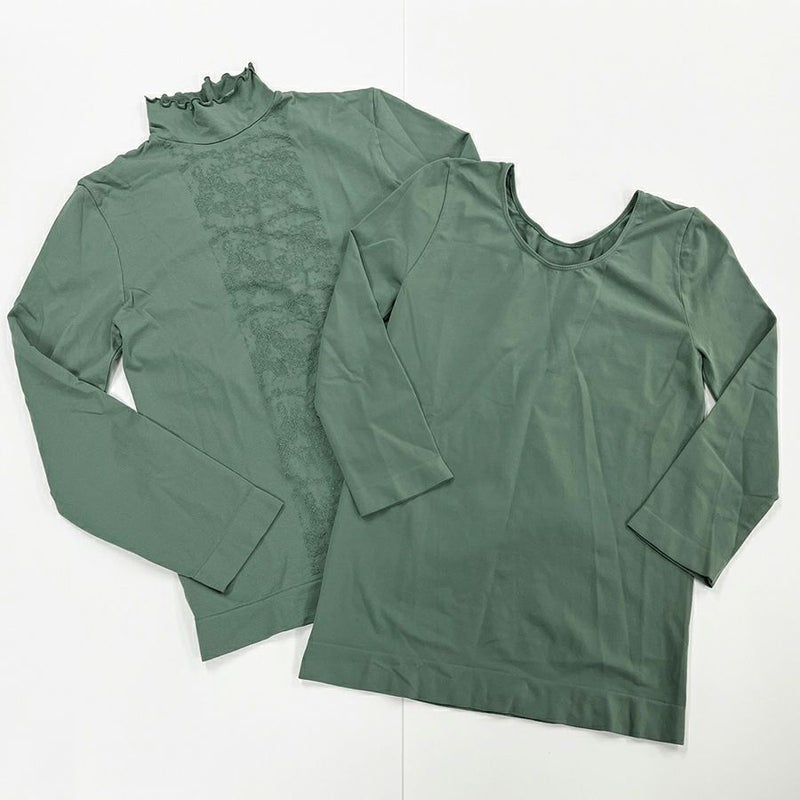 「冬のインナーにはかかせないシンプルな七分袖と縦ラインに花柄をあしらったロングスリーブのお得な2枚セット!
