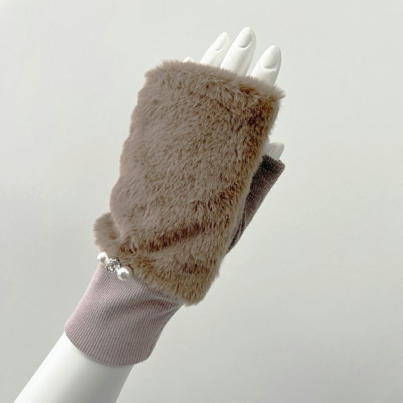 ファーが手を優しく包み込んでくれるのでぬくぬく温かいアイテム。ビジューがついていて、防寒とおしゃれの両方を叶えてくれる優れもの。